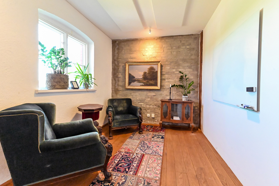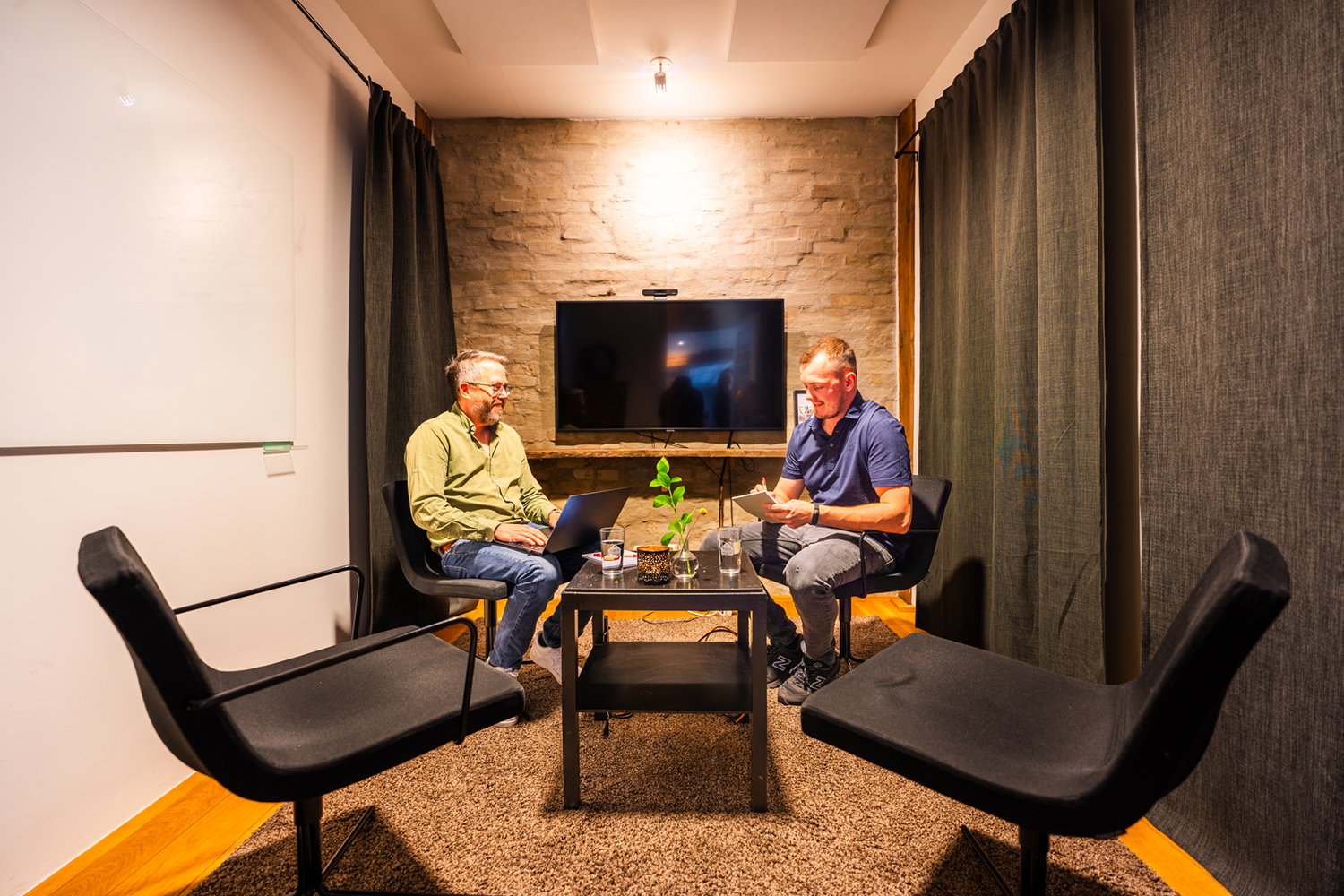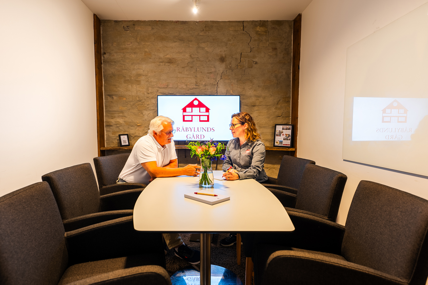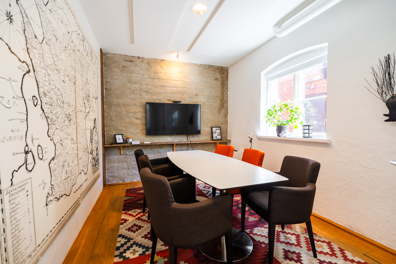 Vi har fyra mindre mötesrum som kan bokas individuellt för möten för 2-6 personer. Två av rummen har fönster ut mot landskapet eller innergården, de andra två rummen har glasad dörr mot lobbyn.