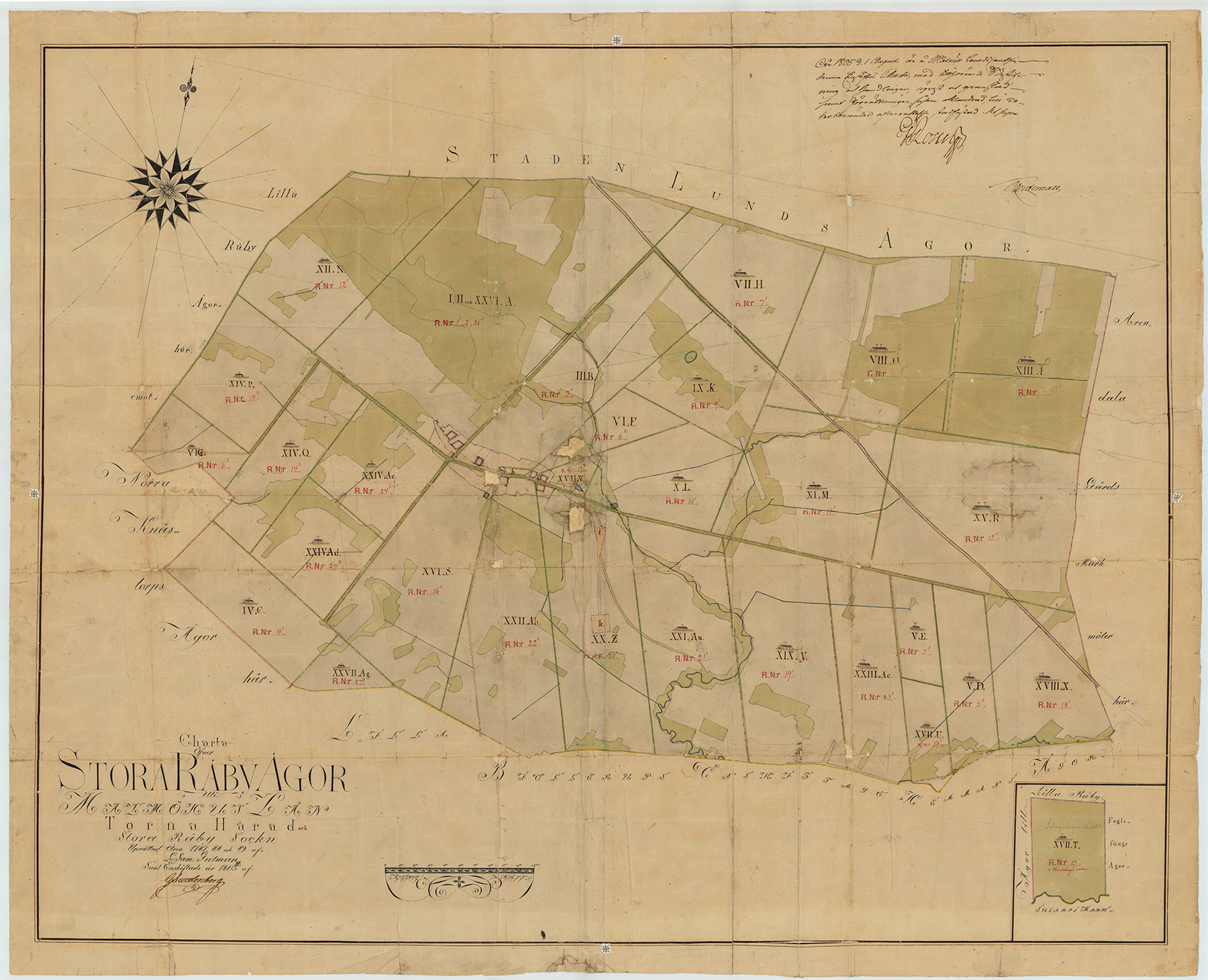 Storskiftet genomfördes 1787-89 i Stora Råby och syftade till att minska det antal jordlotter varje gård hade, men fortfarande skulle varje gård ha andel i varje ”sorts” jord. I Stora Råby fanns tre sädesvångar – Norre, Östre och Södre Wång – och dessa vångar skulle delas upp i som mest fyra ”fall” utifrån jordens godhet.