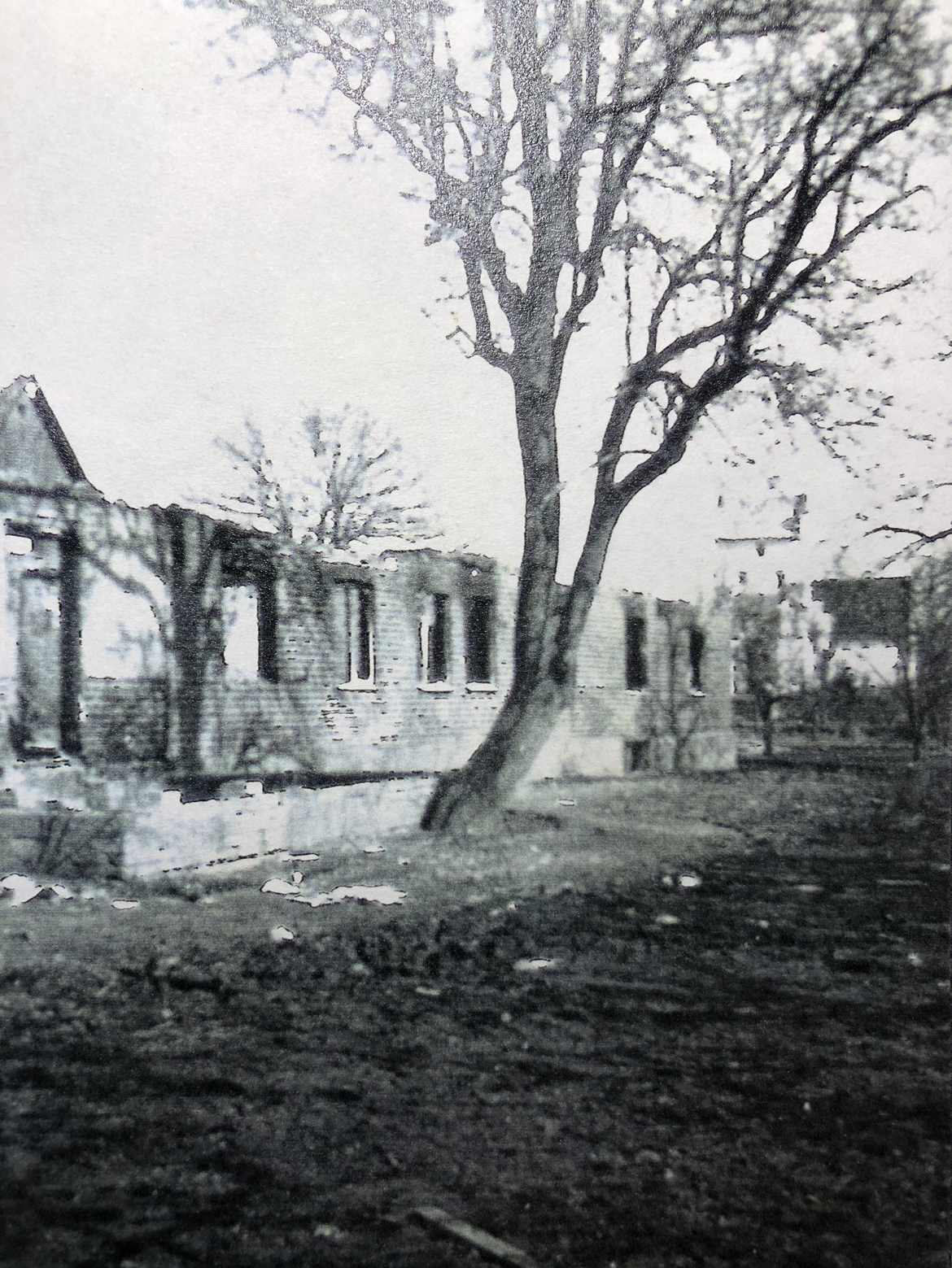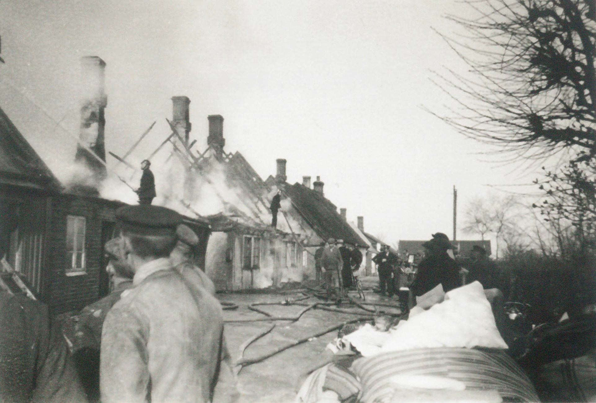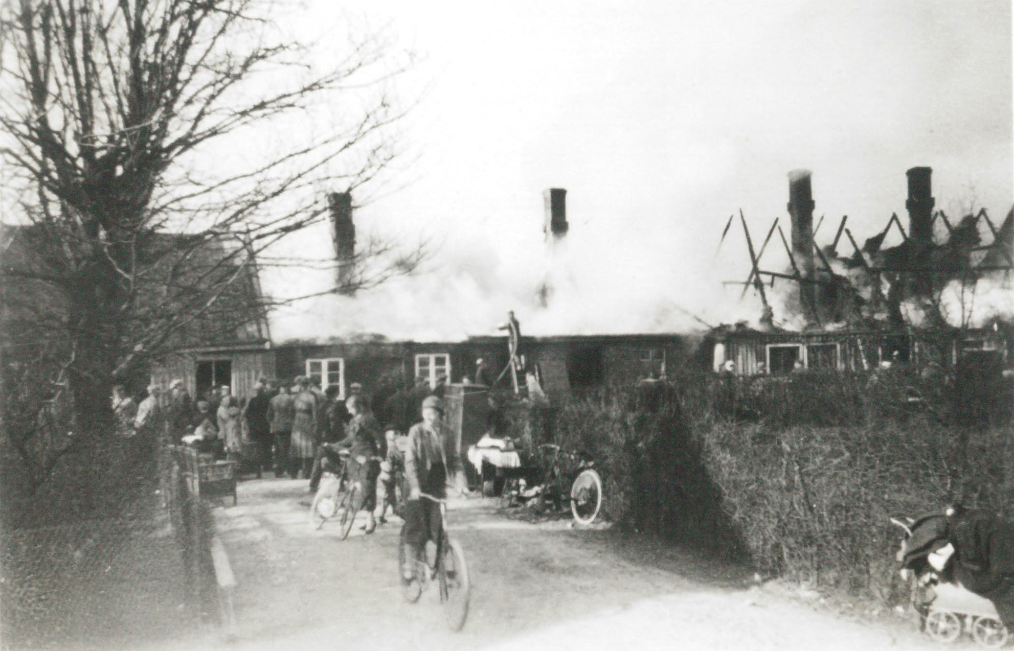Bilderna visar familjen på gården, en fyrlängad korsvirkesgård med halmtak, på 1920-talet innan den brann ner 1930, samt senare på den nya gården som byggdes på hög sockel och i maskinslaget tegel, ritad och uppförd av byggmästare Berlin från Dalby.