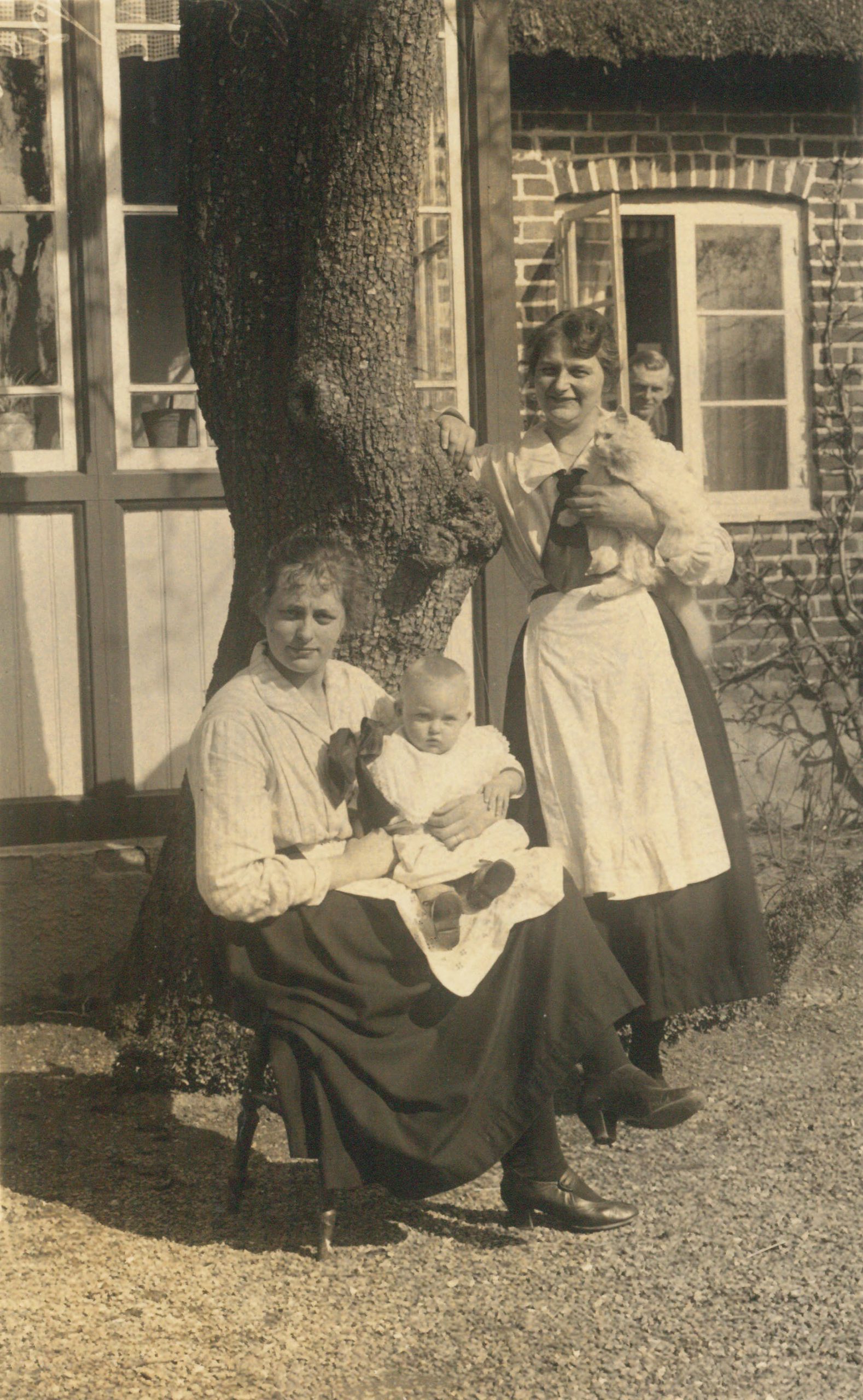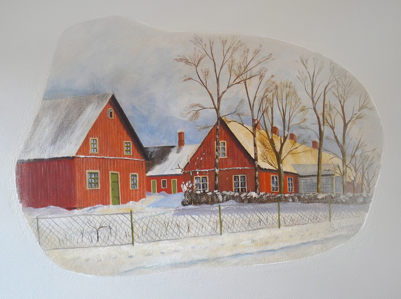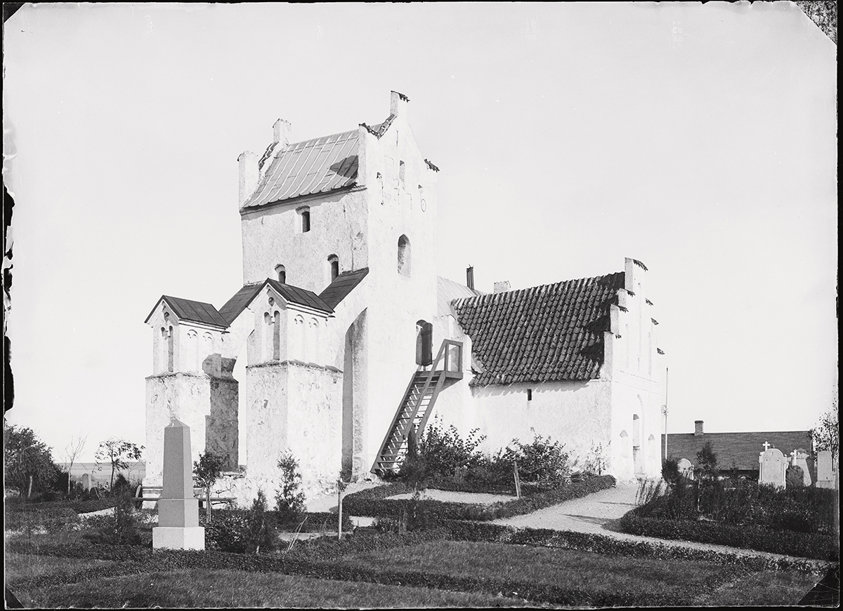 Bilderna visar familjen på gården, en fyrlängad korsvirkesgård med halmtak, på 1920-talet innan den brann ner 1930, samt senare på den nya gården som byggdes på hög sockel och i maskinslaget tegel, ritad och uppförd av byggmästare Berlin från Dalby.