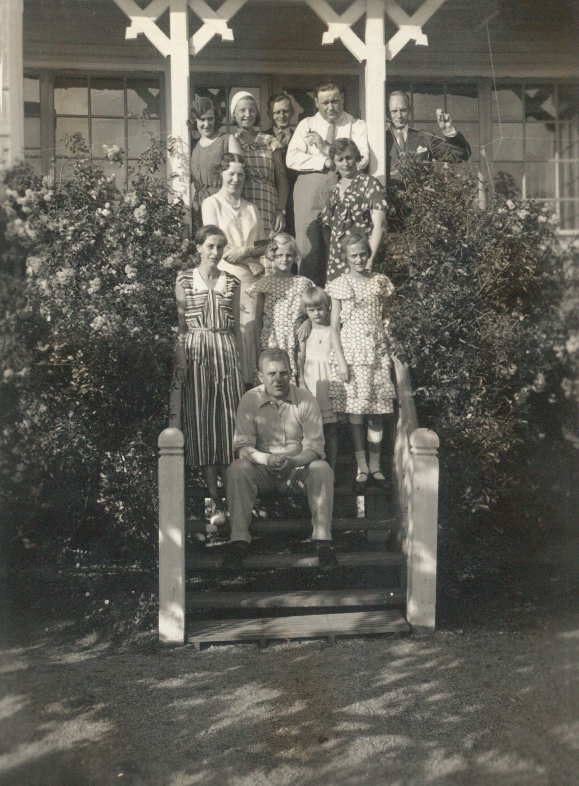 På bilderna ser vi Anna och Nils Pålsson med de tre äldsta döttrarna Ester, Anna-Greta och Berit, Sonja och Pålle var inte födda vid tiden för dessa foton. På ett foto står Ester Pålsson (1920-2019) i vetefältet med nuvarande Råbylund och Linero i bakgrunden.
